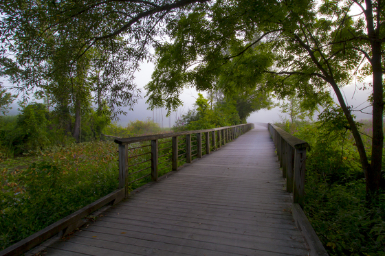The boardwalk leading to the Beaver Marsh in the Cuyahoga Valley National Park on a foggy summer morning.