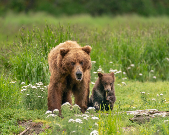 A brown bear sow and her spring cub pause for a moment as they make their way through the tall grass and blooming flowers. The young cub experiencing everything for the first time takes the brief moment to pull grass and tastes flowers, curiosity running wild.