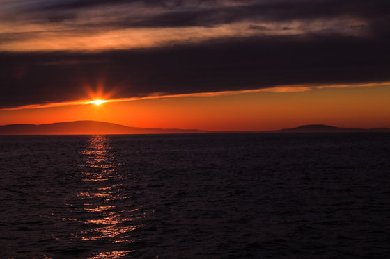 Sun sets over Acadia National Park. As seen from a whale watching boat tour headed back to Bar Harbor.