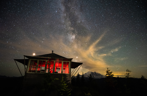 Sometimes the stars align. A beautiful night at Suntop Lookout The big yellowish light above the lookout is Mars. If you look closely you can see the headlamps from climbers on the mountain.