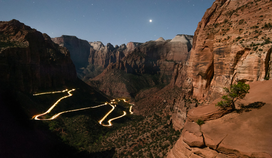 Cars head up the canyon toward the tunnel at night. The bright light in the sky is Venus.