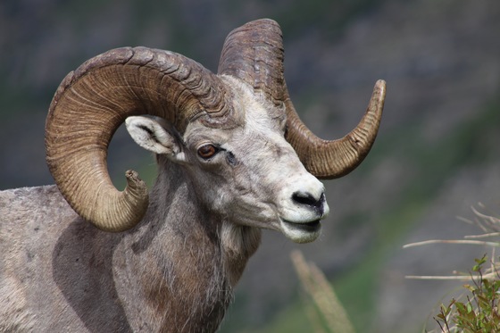 Bighorn Ram grazes on mountainside in the steep cliffs and sharp vistas of Glacier National Park.