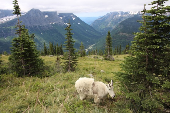 A mountain goat grazes high in a valley deep within Glacier National Park.