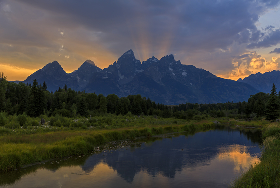 In this view the rays of light from the setting sun shoot upward over the peaks of the Teton Mountain Range in Grand Teton National Park, Wyoming, USA. This spectacular view was taken from the Schwabacher's Landing along the Snake River straight east of Grand Teton Peak.