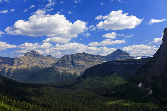 This is a view of the spectacular mountains seen from the east side of the Going to the Sun Road in Glacier National Park, Montana, USA. These towering mountains and lush green valleys are the icons of this picturesque national park. This view is from the Going to the Sun Road which runs from St. Mary on the east side of the park to Apgar on the west side. It's highest point is at Logan Pass at 6,646 feet above sea level.