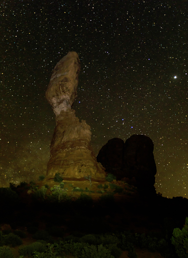 This a nighttime view of the Balanced Rock Formation under the starry skies of Arches National Park, Moab, Utah, USA. Balanced Rock, one of the most iconic features in the park, stands a staggering 128 feet (39m) tall and is easily viewed from a turn-out on the park's scenic drive.