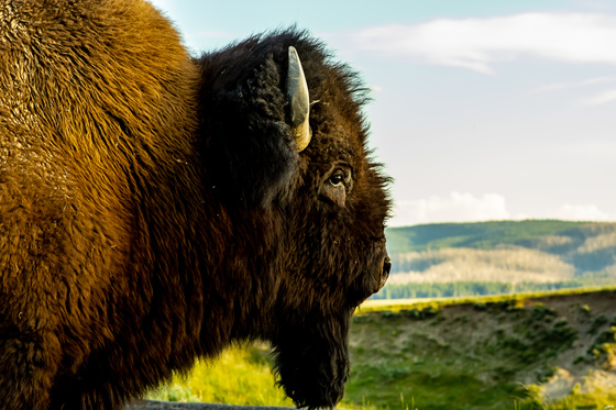 A Yellowstone buffalo looking out over Hayden Valley as the sun sets in the distance.
