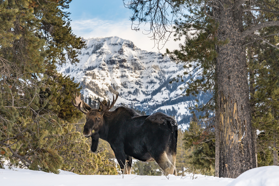 Determined to find a new vantage point I pushed on past the busy pullout. In the distance you could see the moose responsible for such excitement, trudging through the deep snow, inspecting each bush along the way. I drove another 2 miles then parked. Camera in hand & bundled for a blizzard I walked the tree line until the forest opened to the valley. The moose now almost a mile away but headed in my direction. I sat against a tree & waited. 4 hours later this Bull Moose casually strolled by.