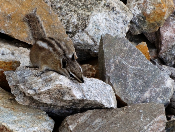 A fur coat of angles and stripes provided good camouflage for this Least Chipmunk amid multi-colored rocks and boulders of a pull-off of the Beartooth Scenic Highway. The only reason I saw him was because my peripheral vision picked up movement on the rocks; but, he scurried so quickly and he was so small (about four inches long), it was hard to get a clear photo of him. Finally, he stopped one time long enough to decide which direction he was headed to next.