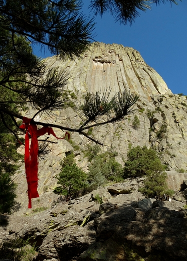 Bear Lodge, as many Northern Plains Native Americans refer to this tower, is often used for ceremonies, vision quests, and spiritual connections. The national park service promotes a voluntary ban on climbing during the month of June every year, out of respect for native and indigenous peoples. Here, red and white prayer cloths have been hung on Ponderosa pine trees which surround the tower's base.