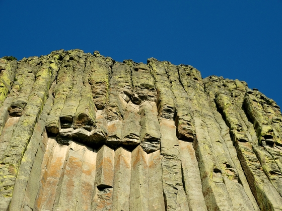 Devils Tower's column erosion with abundant crustose lichen showing on the rocks. It takes a year for crustose lichen to grow 1-2 millimeters in diameter; and, since it takes 25.4 mm (millimeters) to make up just one inch, that's really slow-growing stuff.