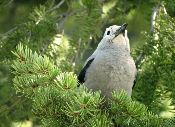 Clark's Nutcracker perched in a Douglas fir tree alongside the Yellowstone River, at about 9,000 feet above sea level. This species was one of the birds identified by William Clark on the Lewis and Clark Expedition, and afterward was named for the famous explorer. It is only found at high elevations, and often at tree ridge lines near water. In the winter, it favors white pine trees (eating its seeds), but in the summer will hang out in trees of other species. A bright-eyed watchful bird.
