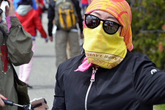 An alien from outer space seeking protection from the sulfur odor at the Lower Geyser Basin.