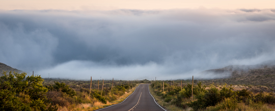 End of the Road Leaving the Chisos Basin in Big Bend National Park. Makes me think of a scene from the movie 'The Fog'. This is what can happen when there is rain the day before in the desert below the Chisos Mountains.