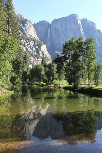 Yosemite Falls reflected in the calm Merced River from the Hanging Bridge. June 27, 2018.