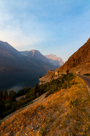 Morning sun on lake St Mary and the going to the sun road