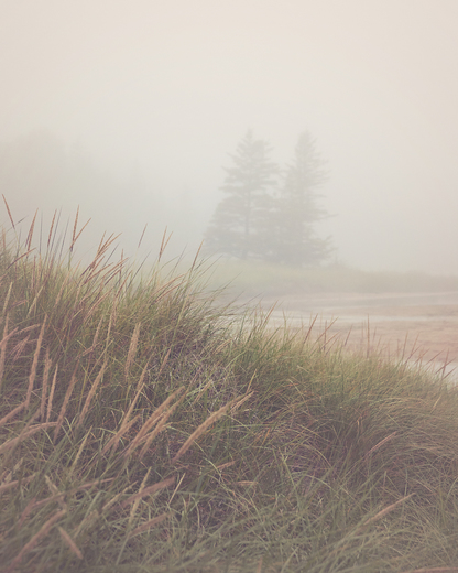 Scenic photo of the beach grasses and evergreens in the distance on a foggy evening on Sand Beach, Acadia National Park.