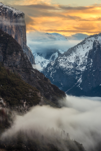 Fog runs through the valley during a beautiful sunrise