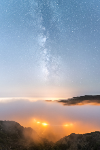 The Milky Way rises over the fog and a lit road winding through the mountains