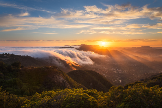 Sunrays pierce through the mountain ridges as fog creeps over.