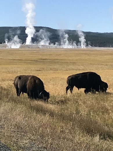 There was a heard of Buffalo of about 20 but they were far and look very tiny. Two buffalo graced us being closer to the roadside and I took these out the car window as we were driving. Loved the fumeroles in background! We were there three days and loved all the areas of the park.