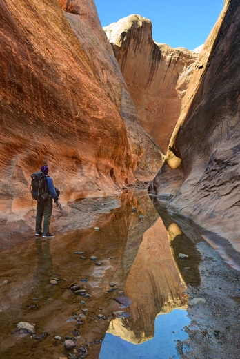 "Hiker in the Halls Creek Narrows." Capitol Reef National Park, Utah.