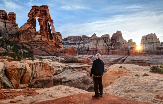 "Hiker at Druid Arch at Sunset." Canyonlands National Park, Utah.