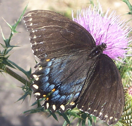 Black and Blue Butterfly on a Thistle. This particular butterfly finally rested on this thistle so I could gt a few photos. I used a Fuji DX cmera.
