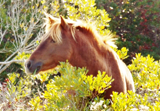 The sun was just right for me to take a few pictures of Wild Horses and this one in particular was in and eatng the yellow weeds. Take with a Fuji DX camera.