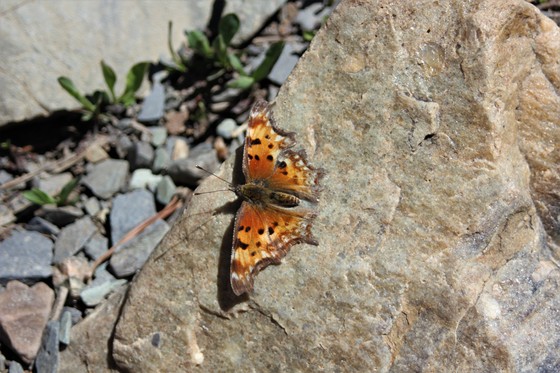 Signs of spring above 10,000 feet in June 2018. Hoary Comma butterfly sunning on a rock next to Stella Lake