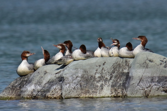 We saw lots of Mergansers while hiking by Bowman Lake. These ones all climbed on a rock to sun themselves. One seems to be singing to the rest.