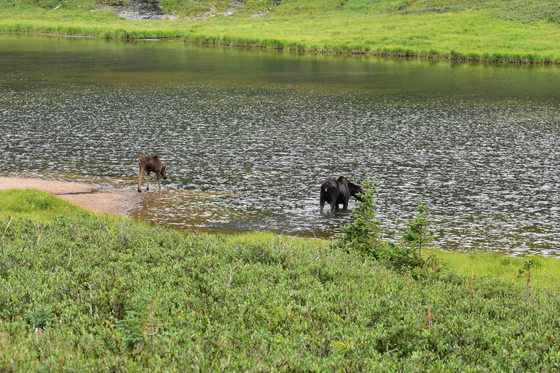 This duo put up quite a show. The mother moose and kid was trying to cross the river and kid moose was afraid of water. They keep on entering in the water and coming back on the shore. Sight for all visitors.