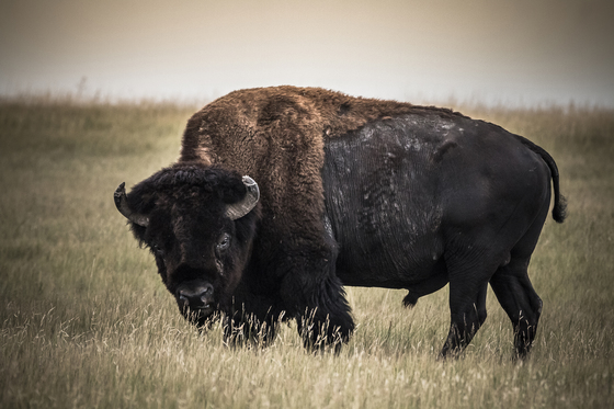 A lone bison in the grass lands on Badlands NP in South Dakota.