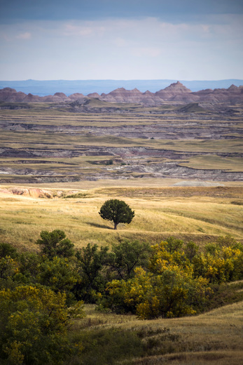 Rolling hills and prairies , cotton wood trees and eroded rock formations in the Badlands national park in South Dakota