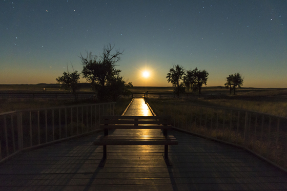 An empty bench on a overlook in the Badlands NP on a starry and moonlit night