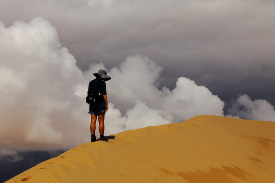 With the cloudy backdrop, my wife appears to be at the summit of a high mountain peak as she crests the top of this sand dune in Mojave National Preserve.