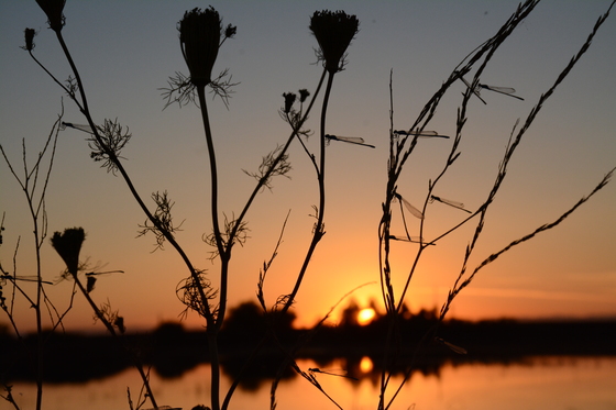 The gathering of the damselflies on a wildflower: Picture was taken at Yolo Bypass Wetland at sunset.