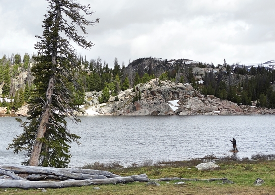 This mountain man was fly fishing while standing on a rock in the waters of the Beartooth Lake on a cold and windy day in July. This is in the Shoshone National Forest and is a pull-off along the Beartooth Scenic Highway in Wyoming.
