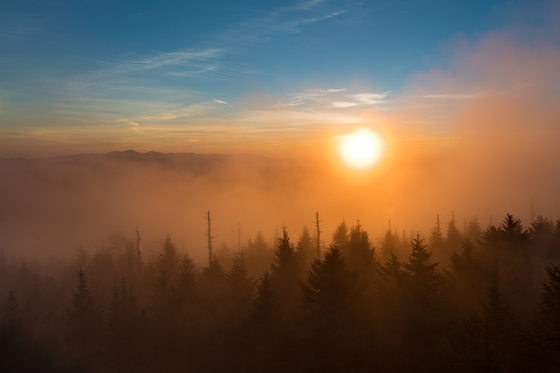 On a recent trip to the Great Smoky Mountains, we climbed to the top of Clingmans Dome to catch the sunrise. It was very cloudy when we got to the top, and for most of the time we could not see much further than a few feet in front of us. That made the occasional glimpses of the scenery beyond even more rewarding. This image is one out of a time lapse series of the entire sunrise.