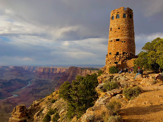 Late afternoon at the historic Desert View watch tower, with unparalleled views of the Colorado River cutting its way through the Grand Canyon