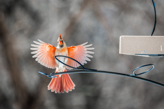 Male cardinal coming in for a landing