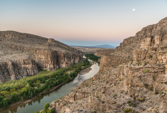 The Rio Grande at sunrise with the moon above, viewed from a ridge along the Hot Springs Trail.