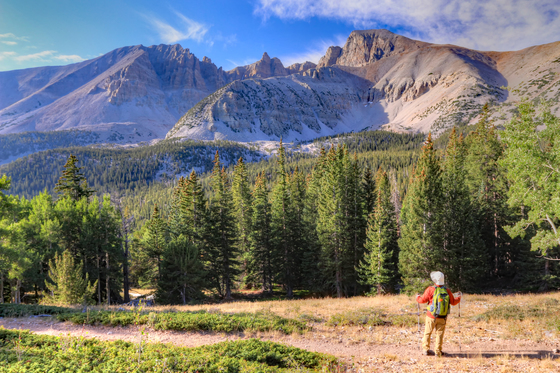 Journey's Start - A hiker looks toward the summit of Mt. Wheeler in Great Basin National Park. We eventually made it to the summit of Mt. Wheeler, the peak on the right.