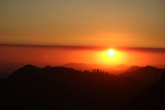 A Sunset over the California Valley. From the top of Moro Rock in Sequoia National Park the sun pierces the Valley Air to make a beautiful orange glow throughout the rolling foothills just below the Sierra Nevada and the Valley which it guards. The Night Sky is a long exposure picture of the galaxy curving its way down over the Sierra Nevada down to the city lights below.