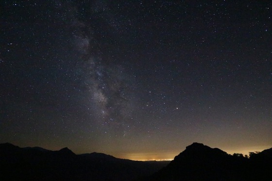 A Sunset over the California Valley. From the top of Moro Rock in Sequoia National Park the sun pierces the Valley Air to make a beautiful orange glow throughout the rolling foothills just below the Sierra Nevada and the Valley which it guards. The Night Sky is a long exposure picture of the galaxy curving its way down over the Sierra Nevada down to the city lights below.