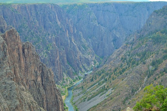 This scene is from the top of the Black Canyon walls looking down at the Gunnison river that runs runs through the canyon.
