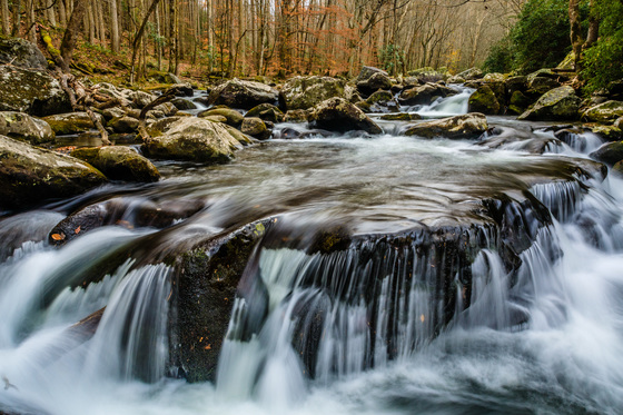 The cascade of Middle Prong Little River is beautiful in autumn when the leaves turn red.