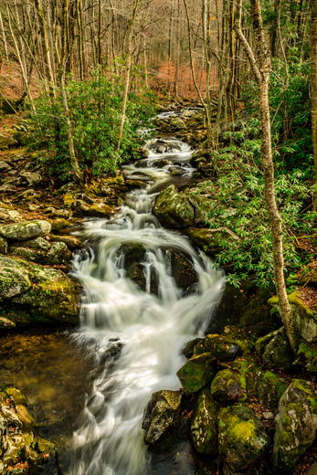 great view on the small wooden bridge across the Middle Prong Little River. The water comes from the forest and winds. The little waterfall and cascade looks great in the sunshine.