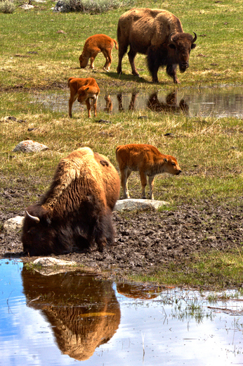 A Herd Of Bison With Newborn Red Dog Calves Wander Through The Northern Section Of Yellowstone National Park As They Graze And Sip From The Ponds Along The Way.