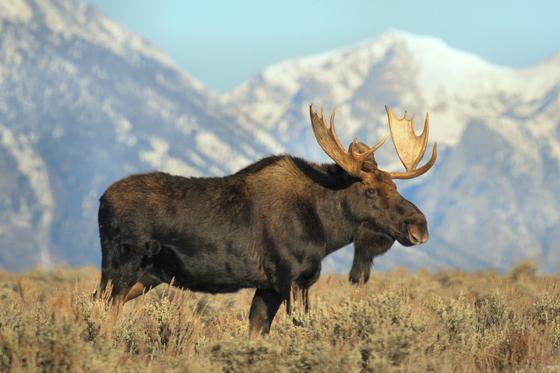 A Large Bull Moose Stands In The Brush At The Base Of The Teton Mountain Range At Grand Teton National Park In Wyoming.
